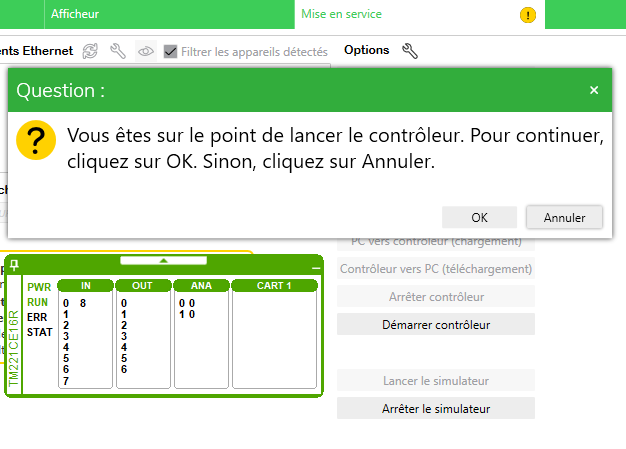 Démarrer le contrôleur AVANT de lancer le simulateur en activant les boutons Lancer le simulateur et Démarrer le contrôleur dans l'onglet Mise en service d'EcoStruxure:
